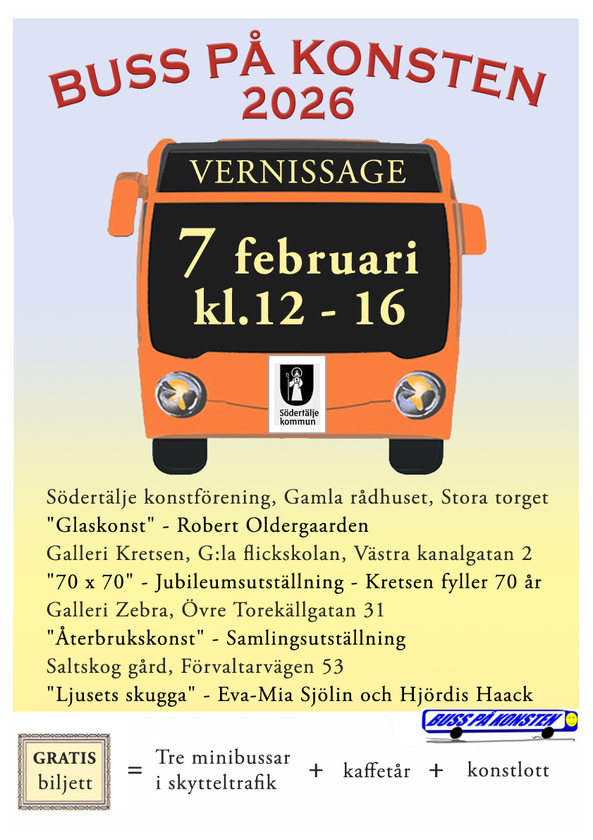 På lördag den 7 februari är det dags för årets ”Buss på konsten” i Södertälje. Nu kan man återigen åka minibuss mellan 4 gallerier. I år ordnas arrangemanget av Södertälje konstförening, och bussarna utgår från Stora torget, utanför Gamla rådhuset. Evenemanget är gratis i år och biljetterna kan hämtas hos Södertälje konstförening i Gamla rådhuset.